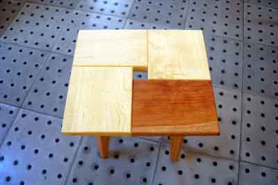 | 週末工房8で製作記事を書いた。これはエノキとブラックチェリー。脚はすべて楢。中央の穴は、指で持ち上げ易い大きさにしておくとよい。 | ![]() |