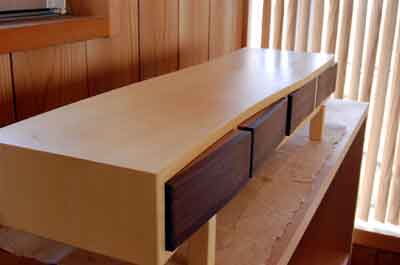| 時のように、ゆったり流れる、河のイメージにしたかった。最初は引出も同じカーブにすつつもりだったが、実際の河のように様々な流れが絡みあうのも面白いかと思い、反対のカーブにしてみた。突出部は取っ手にもなる。 | ![]() |