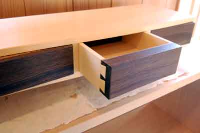 蟻組引出の利点はなんだろう。薄い側板が使えること、強度があること、視覚的な美しさ・・・、でも一番は、「そうしたい」という心意気だろう。 |