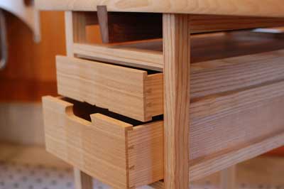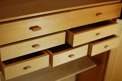 | 扉の中にも5つの抽斗があります。すべてアリ組で無垢の 底板、前板の一部をストッパーにする構造です。 |
