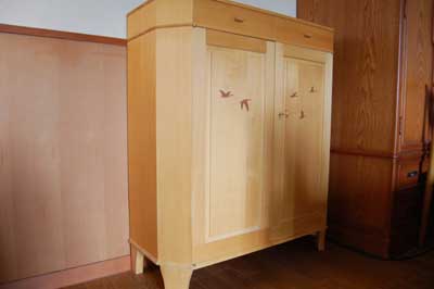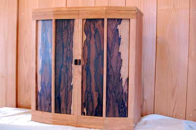 思い出の箱V チェリーと鏡板にシャムカキを使ったキャビネット。 扉はクレノフ氏の作を真似た習作。 |