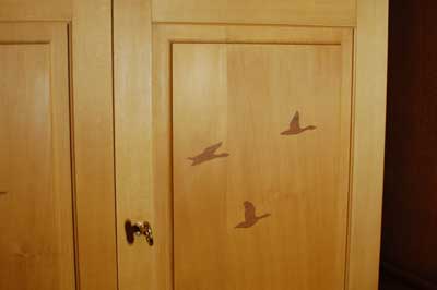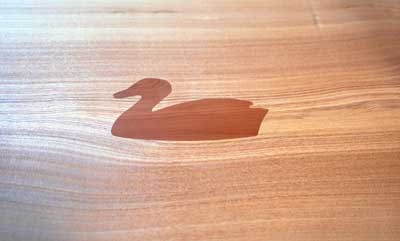 オリジナルの家具にはない鳥のインレイを入れました。 前を飛ぶ若鳥を後ろから成鳥が見守っています。 |