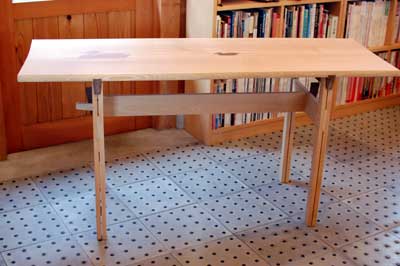 組み立て式の脚部です。二枚の板を複数のサネで3mm のスキマをあけて結合した脚の構造です。スリムさを優先 したため、少々弱いですが、展示会用のディスプレイテー ブルとして重宝しています。 |