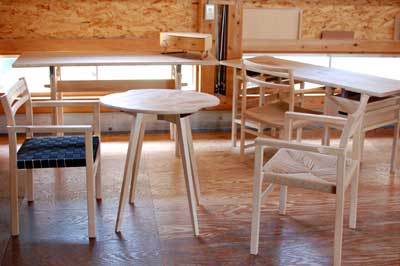 組合せ机「川」 写真後方の二つの机。天板、脚部がそれぞれバラバラに なり、サイズが同じに作ってあるので、組み換えできます。 高さ約5cmの差があり、天板が重なる配置も可能です。 |