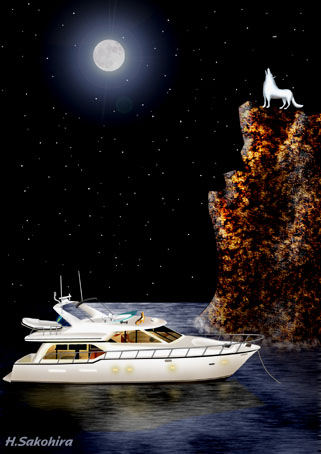 この巨大な、神々しいまでの銀の狼は神の使者であろうか。そして、もはや未踏の地はないのではというほどに文明を持ち込む人類への警告を発しているのであろうか。ところで、このヨットの天井にいる茶色い生き物は、あまりに小さいのでトカゲなどのは虫類のようにも見えるが、実はシェパード(犬)である。それにしてもこのオオカミでかすぎたかな。 |