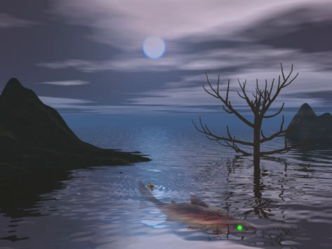 Sakaki氏の発想で僕が作る、With BEER(不可欠)なCGです。これはある暑い夏の夜、氏の見た 悪夢だそうで、その中で彼はなぜかカブトムシになっており、不意に湖の中に落ちて しまったとのこと。そこへ氏を狙ってどこからとも無く現れたBrownTroutの目が緑に 輝いていて、「とても恐ろしかった…」そうです。夢から覚めた彼は、「この時ほど命がある 事を神に感謝したいと思った事はない。」とのこと。その後の彼は、カブトムシに やさしく、ブラウントラウトに冷たい人になってしまったとか。(何のこっちゃ!!) |
