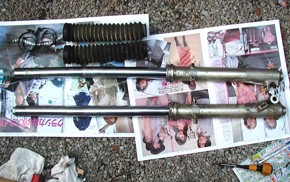 まずフロントフォークを取り外す。シールがいかれているので、シールとオイルの交換だが、これは万力もないし、フォークオイルの手持ちもないので、元所有者でレストアのベテランである寺崎氏にお任せすることにした。ついでにフロントブレーキのシューから剥離したライニングの接着もお願いすることに・・・。(諸氏からは命を預かるブレーキだから、新しい部品にした方が良いとのご意見もありましたが・・・。) しばらくしてフォークとブレーキが出来上がってきたが、ここでまた問題発生。寺崎氏曰く、若干だがフォークが曲がっているとのこと。曲がったフォークだがシール交換はしてしまったとのことである。(汗 このままフォークを使う訳にもいかないので、オイルシールを再注文し、もう1台の方のフォークもやっていただくことにする。数日後、手持ちのパーツリストの部品番号で注文しておいた部品が到着し寺崎氏に渡し、しばらくすると、またまた問題発生。寺崎氏からシールのサイズが合わないとの連絡が来た。どう見ても小さいとのこと。部品を注文しているバイクショップへ話をすると、開封後でも部品違いであれば交換してくれるとのこと。よくよく調べてもらうと、手持ちのパーツリストは初版で、間違いが多く、発行後すぐにリバイスされたようだった。はじめにシールを注文した時は車体番号で注文したので、ちゃんとしたものが来たのだった。こんなこともあるだなぁ・・・。やがてフォークも出来上がり、車体に取り付けた。
