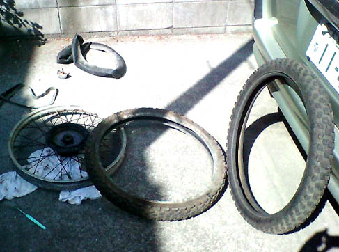フロントホイルは現在再生中のヤツより、部品取り車(その1号)の方がタイヤの山が残っているので、そのまま使おうしたが、よく見るとタイヤのサイド部分に多数亀裂があり、車検を通すのには無理がありそうだ。結局ベアリングの状態で再生中の方のホイルを使い、タイヤは89年式のセローが新車時に履いていたタイヤが余っていたので、2.75とちょっと細いが(本来は3.00です。)それを組むことにする。タイヤを組む前に実は大変な仕事が待っていた。それはスポークの錆取りである。部品が出るなら、スポークは張り替えた方が早いといったご意見も多々あったが、使えるものは極力使う方針で、修行のような錆取り作業に専念すること数時間、何とか妥協できる所まで錆が落ちたので、あとは錆止めにクリアのスプレーを噴いて、リムのタイヤ側の錆もワイヤブラシで落としてタイヤを組んだ。