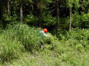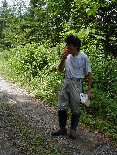 ザックで揉まれて,つぶれかかったトマトをおやつ代わりに食ってる地下鉄氏。大窪林道にて。