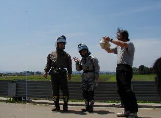 寺さんXRのFタイヤに空気を入れているの図。エンジンもカチカチ言ってたけど・・・。