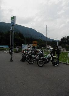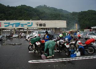 ブイチェーン下郷店での買い出し。手前にカッコいいハーレーの集団が止まっていた。それに比べて,寺崎組はこ汚い!
