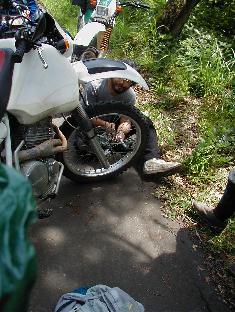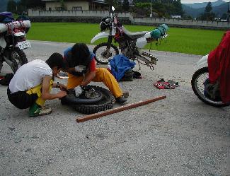 夕立の黒雲が近づく中,パンクを修理するナース青木氏。組み付けてビードを上げようと奮闘しているところに,ご近所のお兄さんが「コンプレッサーあるよ!」と,現れた。Oh,Lucky!