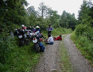 関東班,安ヶ森峠でカッパを着るの図。安ヶ森林道栃木側は完全に舗装されてしまった。ちなみに,御霊櫃も全舗装目前。