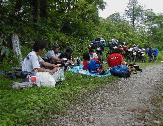 大窪林道で休憩中。その後も誰も動こうとしないので,実はこのまま昼飯になってしまった。
