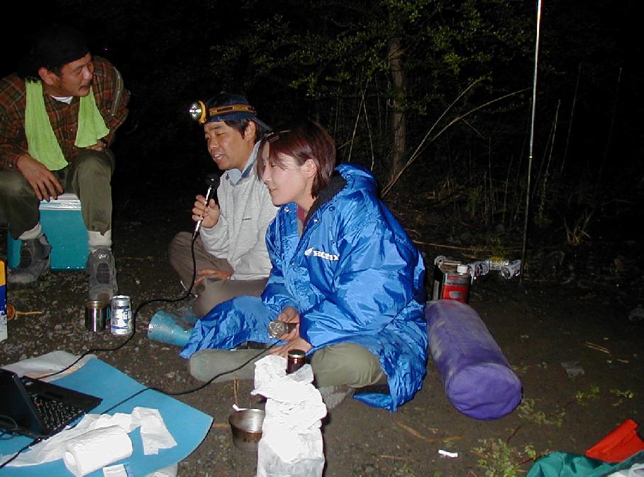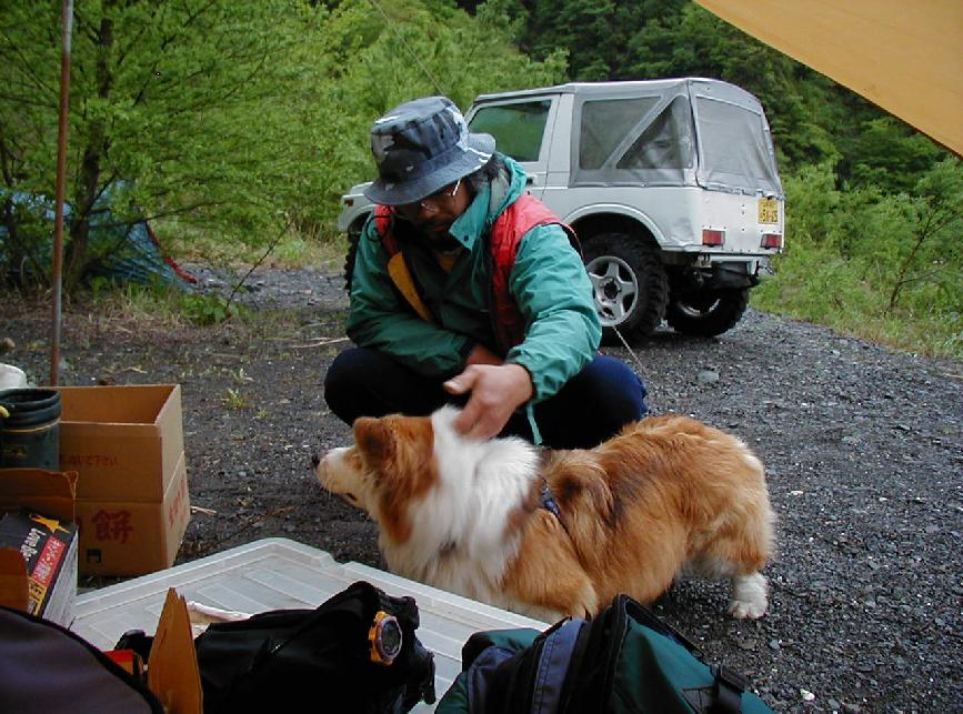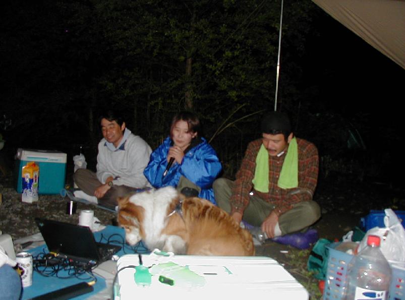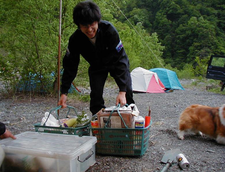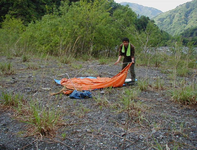 今回の忘れん坊大将,酔っぱらい金子氏。テントとペグは持ってきたが,ポールを忘れる。おまけに家の玄関まで持ってきておいてクーラーボックスも・・・。2日間地下鉄前原氏のテントに間借りして,中のものを飲み食いした後,3日目は朝からテントを立てるの図。テントは寺さんがナチュラルツーリングでも使用してたダンロップ4人用。