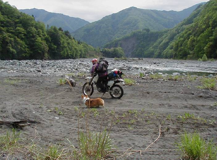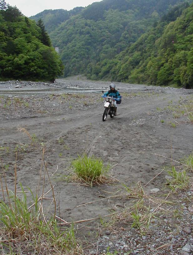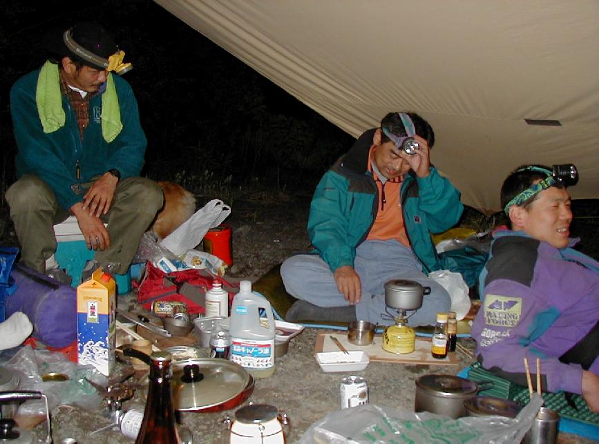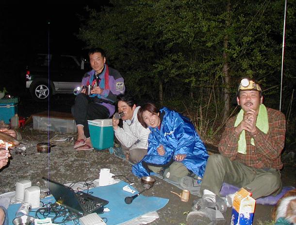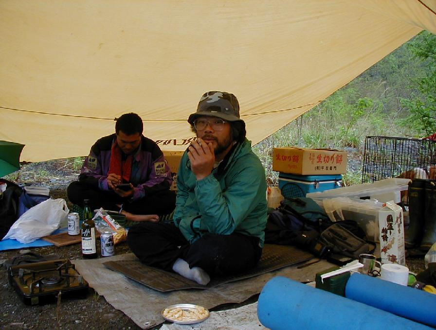 5/4:たとえ昨夜にどんなことがあったとしても,朝はやって来ました。雨はおさまったようです。二日酔い1号と2号は解けては半固形状に,そしてまた解けるのでした・・・。午後,鈴恵さんは体調の建て直しを計り再来襲を目論みながら引き上げ,荷崩れさん,赤貧さん到着。カラオケ齋藤氏は帰還するも,川原からの段差で勢い足らず後輪モグり,廃道登りはあと300mというところでズリっといってボロ30で救出騒ぎ。暗くなる寸前に出戻り地下鉄さんがやって来た。