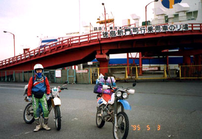 目が覚める頃には、フェリーは既に東京湾に入っていた。到着30分前にはアナウンスと共に音楽が大音響で流れ、寝ている人もたたき起こされた。そそくさと、下船の準備をし、接岸後バイクの置いてある甲板へ行き、係員の合図でエンジンを始動。長かった四国ツーリングもいよいよこれでおしまいだ。順番を待って埠頭に下りた後、フェリーの前で記念撮影をして、ター坊は357号からレインボーブリッジ経由で横浜方面へ、私は豊洲、銀座、半蔵門経由甲州街道で一路帰路についた。