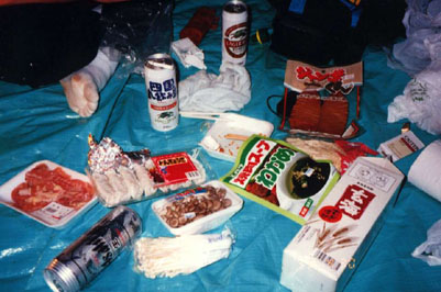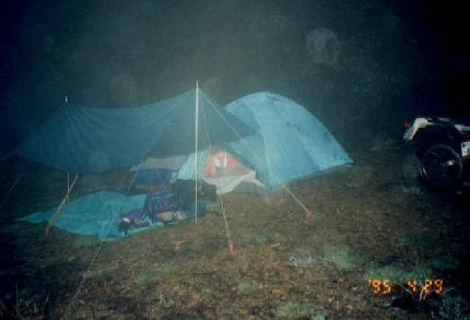 雨が小やみになったので,タープを立てて宴会を開始するが,途中で雨は元のように降り始め,途中でテントに移動となる。いつものように飲みつつ,ふとラジオをFMにしてみると,何と聞こえるではありませんか,FM放送が。さすが四国は狭いのですよ。こんな山中でも都市までの距離は以外と近い。放尿しに崖のところまで出てみれば,眼下には439号を走る車の明かりが見えた。などなどしているうちに,酔いは回り四国第1日目の夜は更けていった。
