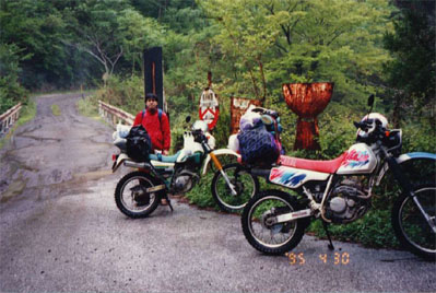 昼飯のため,スーパー林道終点から195号を木頭村へ左折し,最初にあった酒屋で停まる。パンを買って道端で食っていると,店のオバチャンがいすにして座るようにと一升瓶のケースを持ってきてくれた。しばらくすると,また雨が降り始めた。するとオバチャンは今度は店の中に入れと勧めてくれた。たかがパン1個と缶コーヒーしか買っていないこ汚いオヤジ二人に,四国の田舎の人は何と親切なことか。オバチャンに礼を言って,再び走り始める。
