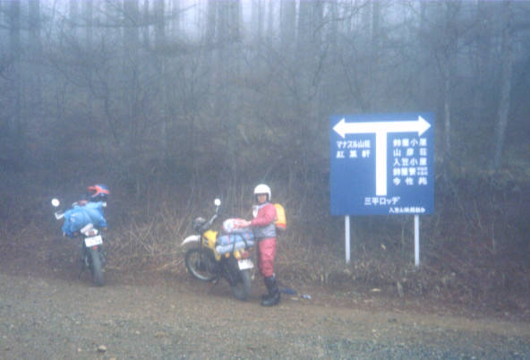 どこまで行っても雨です。高遠を過ぎ,昼食は,伊那市の信州大学農学部前のスーパーの軒下で弁当を食う。かなり情けない。情けなさを引きずって権兵衛峠へ。狭くくねった舗装の上に濡れた枯葉で非常に走りにくく閉口する。鳥居TNから木祖村へ国道19号をすぐ左折,奈川村の農協支所で給油するが,ここの給油機は屋根もなく砂利のひいてある所にぽつんとあり,給油中にタンクの中に雨も一緒に補給してしまう。(色々な所で給油したが,下が砂利だったのは未だにここだけである。)