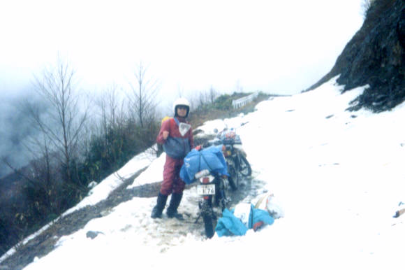 早朝出発を期して前日のうちに府中に集合する。甲府バイパスでター坊の“雨々降れ降れ〜♪(八代亜紀?)”サインと共にポツポツと雨が降り始める。GSで給油&カッパ着用タイムとなる。本降りの中,国道20号線は着実に標高を上げ,なな何と入笠山では,ついに雪が・・・・(寒い!)。(^^;)