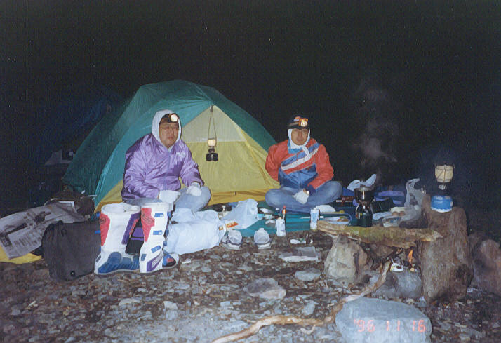 ビールから日本酒と飲み進み,そろそろパソコンカラオケ開始かという頃,暗闇の中を誰かが川をが渡ってこちらへやってきた。向こうでキャンプをしている人だった。向こうは薪のストーブをテントの中で焚いているので暖かいからちょっと遊びに来ないかとのことだ。断る理由も特にないので,つまみと焼酎などを持って行ってみる。寝泊まりするテントとは別に,町内会テントの回りをドカシーで覆ったものが宴会場となっていた。中には薪ストーブがあって,ちゃんと煙突まで付いている。ストーブの横には焚き火もある。何と外には桶のようなものの中にビニールシートを敷いて,ストーブで沸かしたお湯を入れた1人用の風呂まであった。恐るべし,野宿人集団。聞けば中野でサッシ店を開いているご夫婦とその従業員の方々だそうである。キャラバンは仕事と兼用でV6の3000ccの4駆だそうで,野宿にはなかなか頼もしい足だとのこと。何でスクーターで来たのかなど,いろいろと野宿旅の話で盛り上がり,すっかりごちそうになり,すっかり出来上がったところで失礼した。