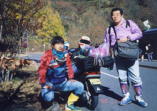 奥多摩湖畔を過ぎて丹波山村に入ると,時たま登りが続くことがあり,またまたJOGは苦戦する。AXISはさすが82ccだけあって,超重量級のター坊をのせていても結構良く走るようだ。丹波渓谷おいらん淵を過ぎるといよいよ柳沢峠の登りつづら折りが始まった。いかにコーナーを減速せずに通過するかに全神経を使う走りとなる。何しろ一度減速してしまうと,その後の登りがきつく,なかなかスピードが上がらなくなってしまうのである。何度かAXISに追いつき,追い抜くこともあったが,やはり古くて非力なJOGは圧倒的に遅く,なんとかかんとか柳沢峠にたどり着いた。峠は風が強く結構寒い。しかし,いつ見てもこの峠からの富士山は美しい。峠からの下りは原付にとって天国のようで,ガードレールに「○○ちゃんコーナー」などとガキのいたずら書きのあるコーナーをスイスイ抜けて(いるつもり?)一気に塩山まで下った。