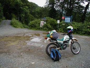 初日は高速で一気に白石まで北上するので、朝7時前には出発した。平日ともあって東北道下り線はガラガラだ。90km/h巡航で北を目指しひた走る。30分も走ると最初の緊張もほぐれ、だんだん暇になってきた。ボーっとしたり鼻歌を歌ったり、忘れ物はないか考え直したりしている・・・・・、アッ〜ッ!!!テントのポールを玄関脇に立てかけたままだっ!この旅の途中で、学生時代の友人と落ち合うことになり、出がけにテントをいつもの2人用から4人用に持ち替えたため、ポールがバッグに入らず、つい積み忘れてしまったのだ。次のICの佐野藤岡できびすを返し、100km/h超で引き返す。金と時間を大幅にロスし9時半過ぎに本日2度目の岩槻ICから東北道へ乗り直す。何か悪いことの前触れでなければよいのだが・・・。昼過ぎには白石に着きたいので、老体のセローにむち打って100km/h超で走り続けた。途中で振動に耐えかねて休んだり、昼飯は食ったりはしたものの、何とか2時前には白石ICを降り、鎌先温泉から南蔵王高原へ向かった。七ヶ宿町に入って直ぐに右折して不忘山林道へ入る。12年前にこの林道を訪れたときは、崖崩れで通ることが出来なかった