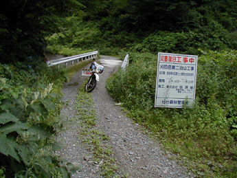 砂利の乾燥した路面はほどなく林間の締まった土の路面となる。非常に緩い勾配とカーブなのでとても走りやすい林道だが、道端には「工事中通行止め」の看板がちらほら見受けられ、イヤな記憶が脳裏をよぎる。やがて、例の前回工事していた場所にさしかかると・・・やはり工事をやっているではないか!道の真ん中には通行止めの標識とウマのバリケードが置いてある。とりあえずバイクを止めて、徒歩で近づいてみる。確かに山側の法面工事はしているが、前回とは違い道は橋の向こうまで問題なく通れそうである。一番近くで作業をしている人に挨拶して、通ることが出来るか尋ねてみると、「別に通るのは問題ないが、この先は行ったことがないので、どこまでいけるかは分からない。」とのことだ。バリケードの脇をすり抜け、ゆっくりと工事区間を通過する。工事区間の終わりにもバリケードがあり、ずらさないと脇が通れなかったが、近くの作業員の方がわざわざずらしてくれた。申し訳ありません。さらに先に通行止の札が下がったロープが張ってあったが、解いてそこも無事通過。
