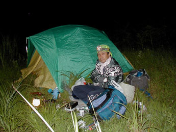 日が暮れると冷えてきて、トレーナーだけではいられず、ジャケットも着込むはめになる。スキー場のせいか、携帯も使えるので、家へメールしたり、友人に酔っぱらい電話をしたりも出来てしまう。最近の野宿もITの進出は目覚ましい。9時半にはデロデロになってご就寝。夜中2時に小便に起きたが、飲みかけだった日本酒を空にして、再びおやすみなさい。
