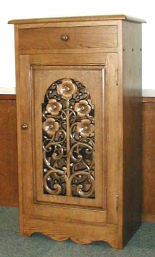 2、右「切抜き彫刻扉 飾り棚」ナラ材 巾60×奥行40×高109,5cm 価格28万円