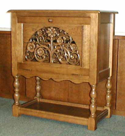 1、左「切抜き彫刻扉 飾り棚」ナラ材 巾80×奥行43×高89,5cm 価格28万円